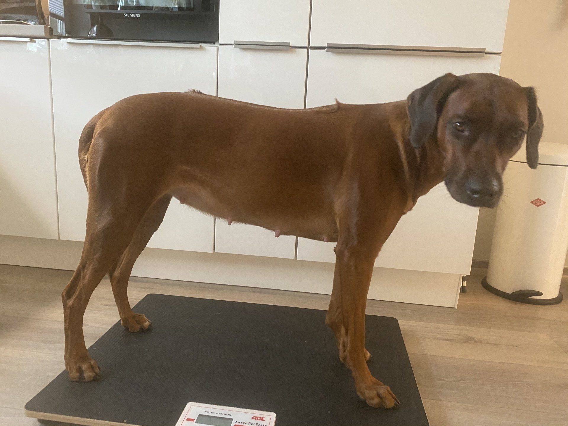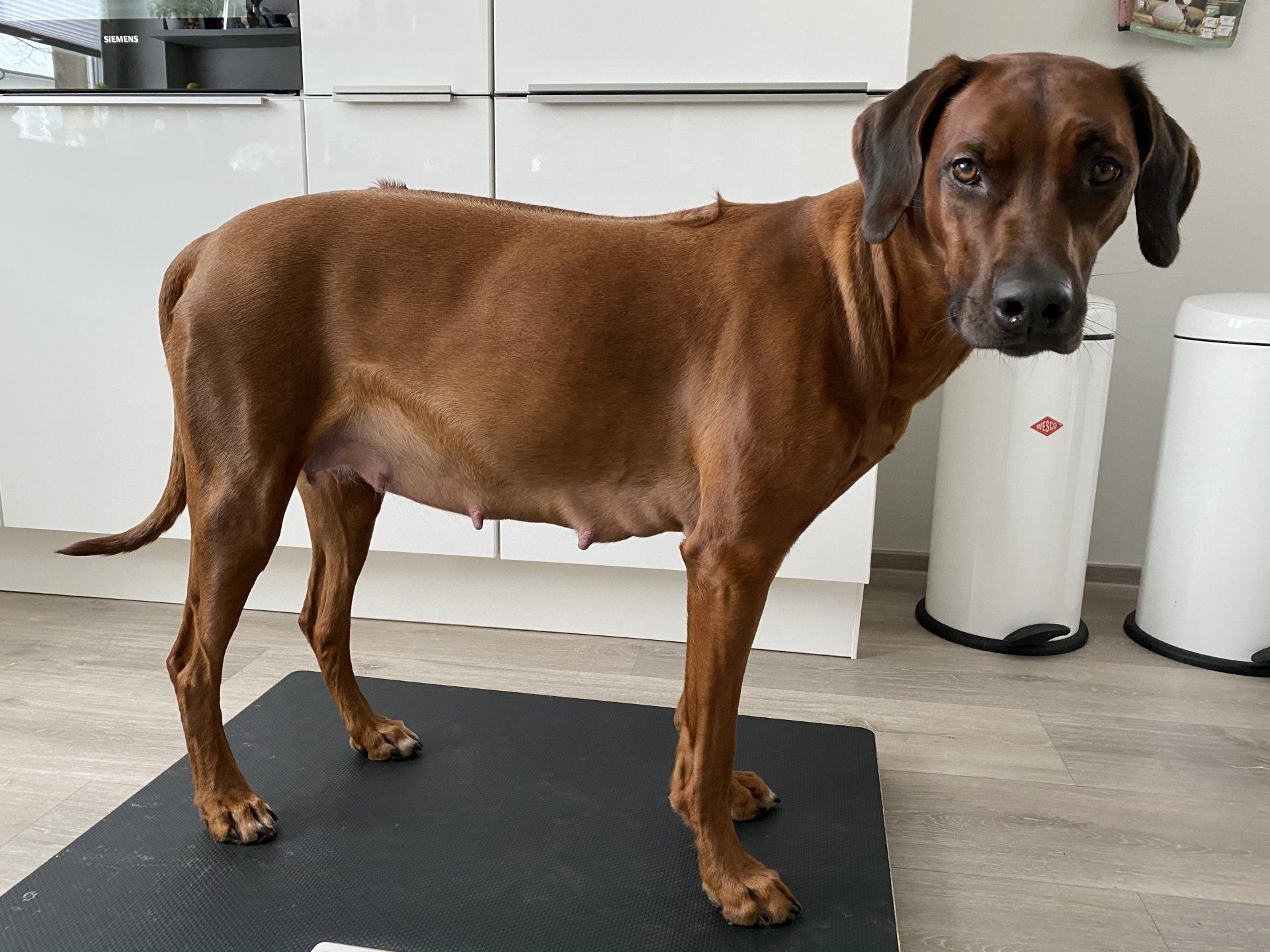In der 5. Woche ging es Peaches echt gut. Sie frisst alles brav leer und war auch munterer auf den Spaziergängen. Nun beginnt ein Bäuchlein zu wachsen, die Zitzen sind größer geworden und insgesamt sieht sie runder aus. Jetzt müssen sich unsere Welpen einfach weiter gut entwickeln und wachsen. Die Mahlzeiten werden nun in den kommenden Wochen immer weiter erhöht, damit die Welpen sich weiter gesund entwickeln können. Zur Seite steht mir dabei Anna's Ernährungsberatung, die Peaches ihre Futterpläne gewissenhaft erstellt. Somit sind die Welpen mit allem gut versorgt. Wir sind alle echt gespannt und freuen uns auf die FlauschGoofys.